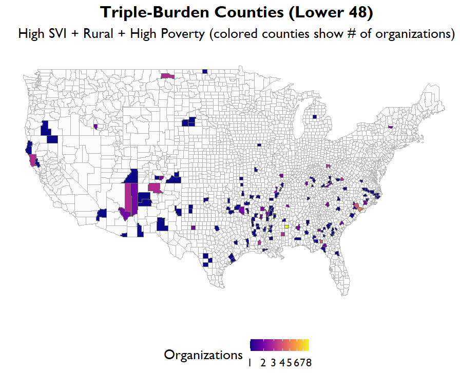The pattern becomes even more striking when we look at counties facing the most concentrated structural pressure. Roughly 9.5 percent of counties meet what we might call a “triple burden” threshold: High SVI, rural classification, and concentrated poverty simultaneously. Yet only 4.4 percent of healthcare organizations are located in these counties. The highest-risk communities are the least densely served.