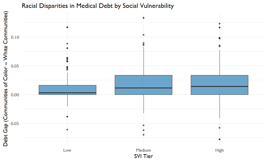 This pattern suggests that structural vulnerability compounds financial health risks. Communities facing greater economic and social challenges are also more likely to experience unequal medical debt burdens.