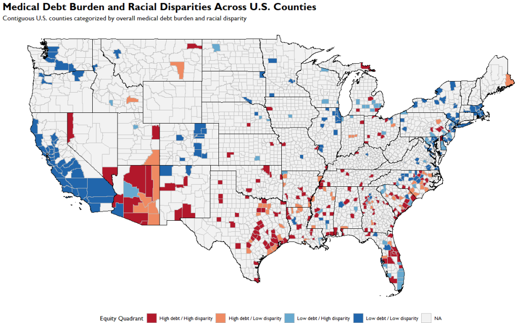 Counties categorized by medical debt burden and racial disparity.