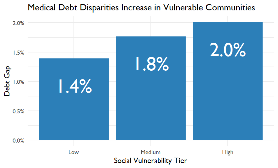 Medical debt disparities increase in counties with higher social vulnerability.